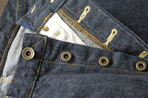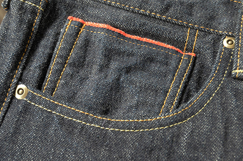 上部に赤耳を生かした印象的なコインポケット。裏地にスレキを張り補強してあります。Tシャツの下からチラリと見えるのもアクセントです。