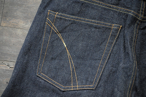 レザーパッチは焼き印を押したゴート・スキンを一枚一枚手もみ洗いし天日干し、その後やはり一枚ずつ丁寧にミシンオイルをしみ込ませたあと再度天日干しにしてジーンズをO/Wし、後付けする手間のかかる仕事をしてもらいました。